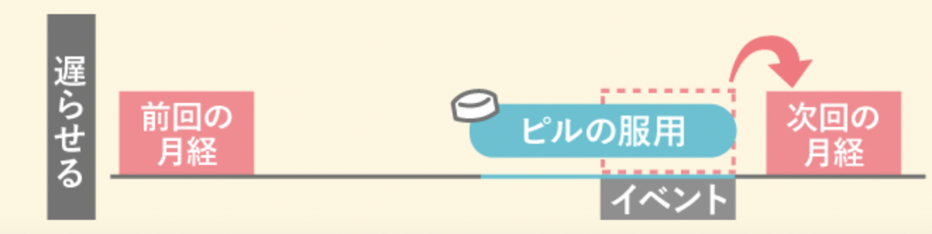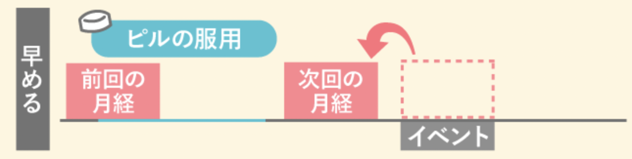生理予定日の1週間前程度から薬の服用をはじめ、薬を飲んでいる期間生理を遅らせます。イベント期間中もピルを飲む必要があり、服用中の副作用の心配もでてきます。