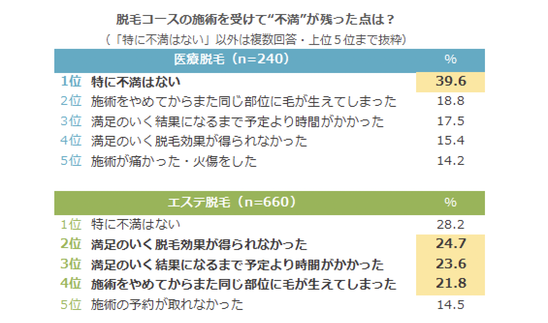 [box class=”box16″]上記の図からもわかるように、医療脱毛のほうが不満がないと回答している人が多いのがわかります。ただ、2位の「施術をやめてから同じ部位に毛が生えてしまった」と回答する人も。ここでは医療脱毛の永久脱毛の定義について解説します。