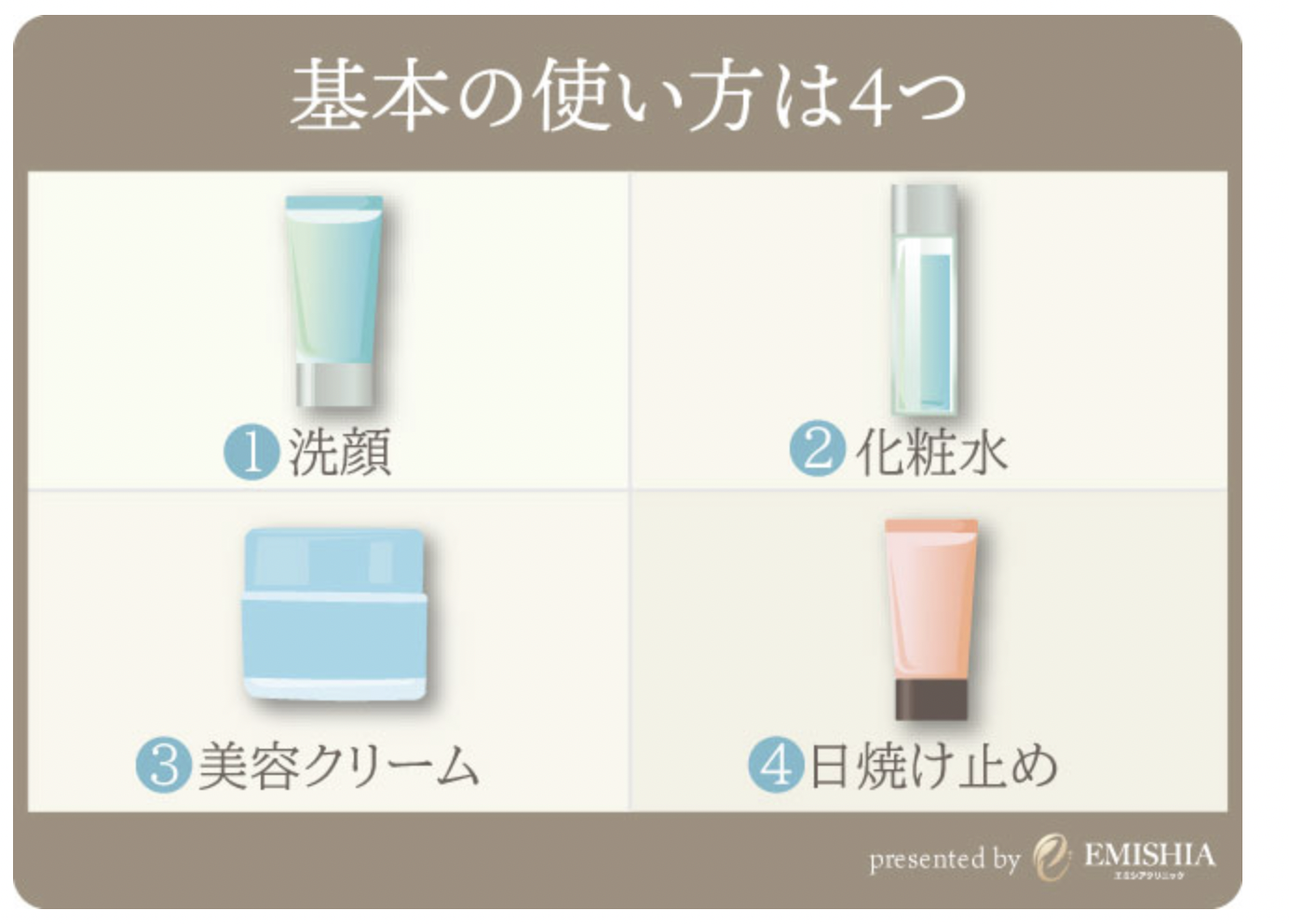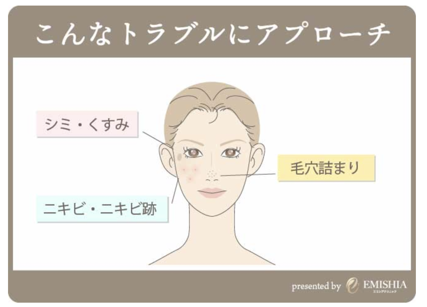 といった効果があり、シミ・くすみ・ニキビ跡、毛穴の開き・黒ずみ・たるみなど、さまざまな悩みに対してアイテムを変えるだけで改善できる万能スキンケアです。[/box]