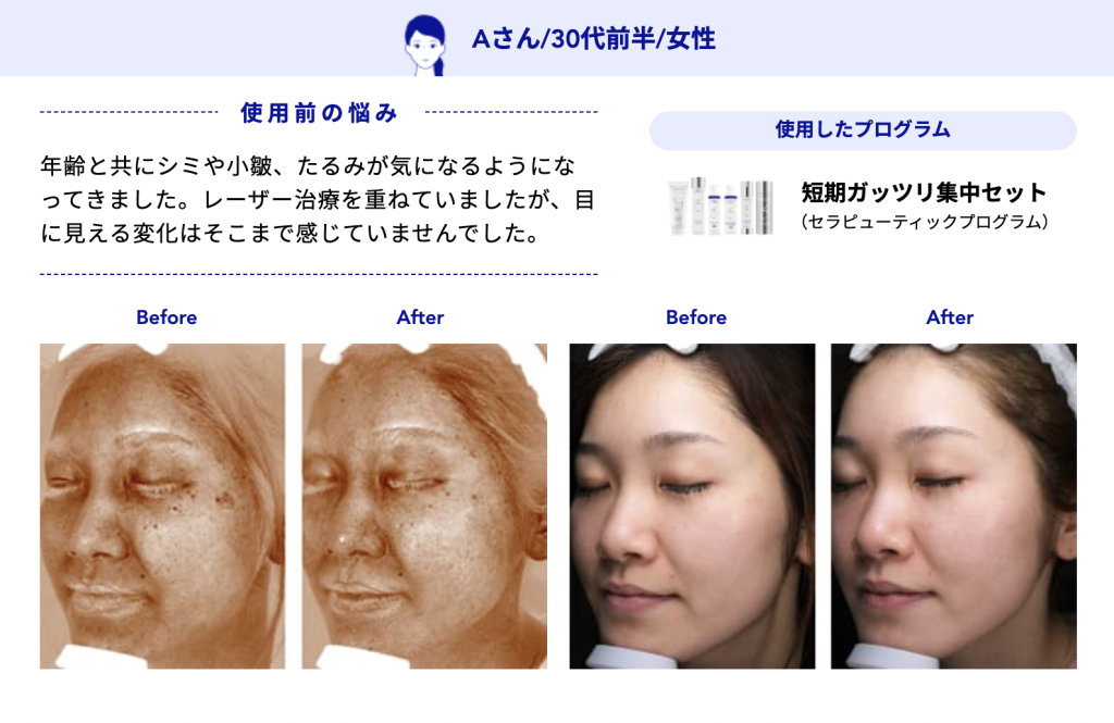 シミの濃さや範囲などのよっては、処方薬を用いたセラピューティックプログラムを選択したほうが効果が高い場合があります。またレチノール配合の商品と併用したほうがより効果的である場合があります。